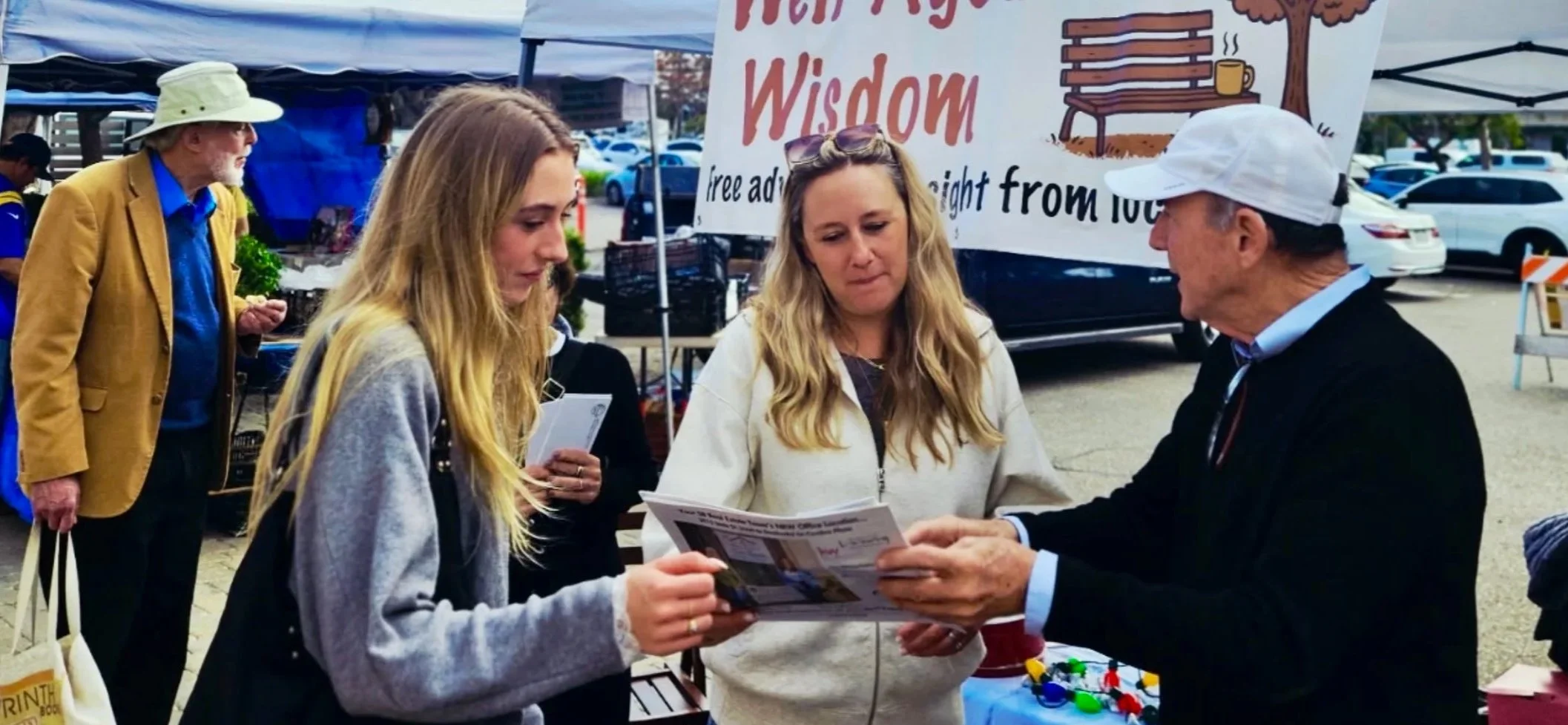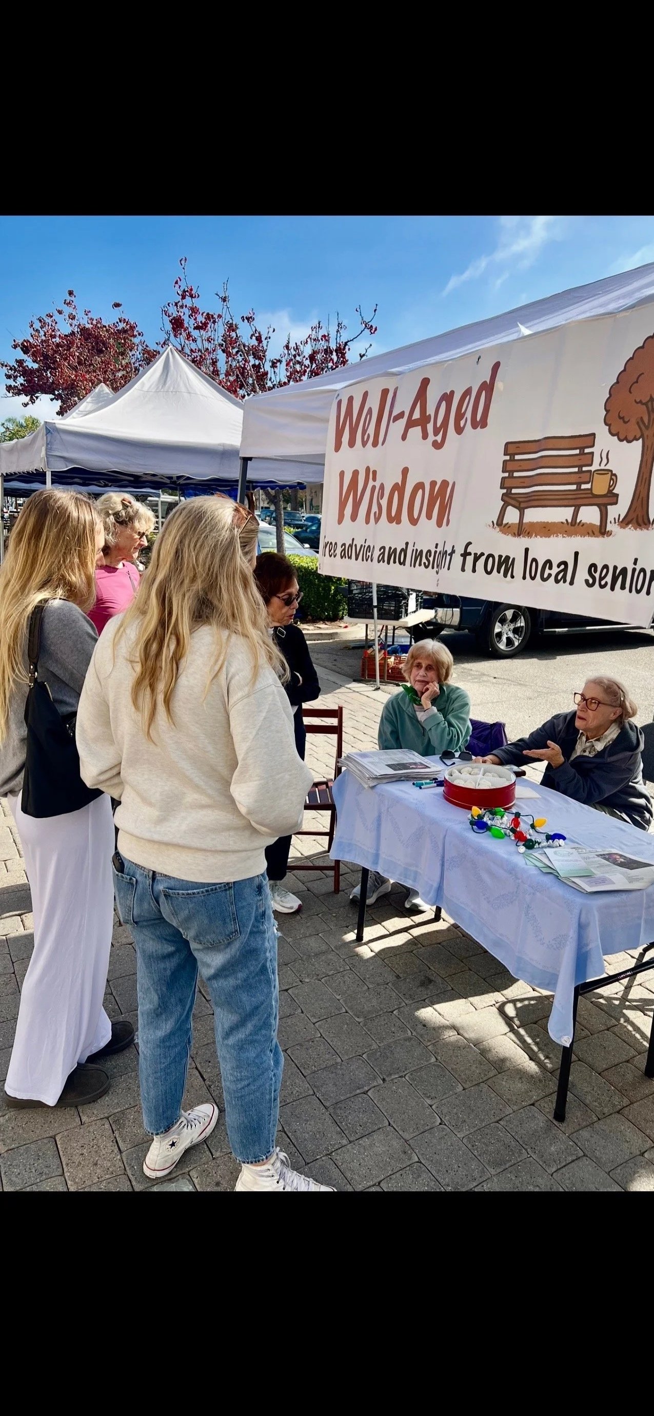 Well-Aged Wisdom is a program of the Center for Successful Aging. On occasional “random” days, we set up a booth at a Santa Barbara location (such as the Farmer’s Market), which is staffed by seniors who offer “free advice” to anyone who stops by with a question. This is not meant as “serious counseling”, but rather is intended as a fun way for seniors to engage with the community and offer advice to anyone with a question, but always with the motto “take it or leave it”. It is a fantastic way for seniors with lots of life experience to share their knowledge, experience and insight at no cost.